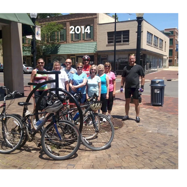 Lunch was at AL'S CREAMERY in downtown Elgin. A group photo of the bike trip 2016 group taking a break in the shade. From left is Jim Conway, Dan Chapala, Paul Mazurek, Barb Kowaski, Lynn Creegan, Dave Clark, and Laurie Pasturczak